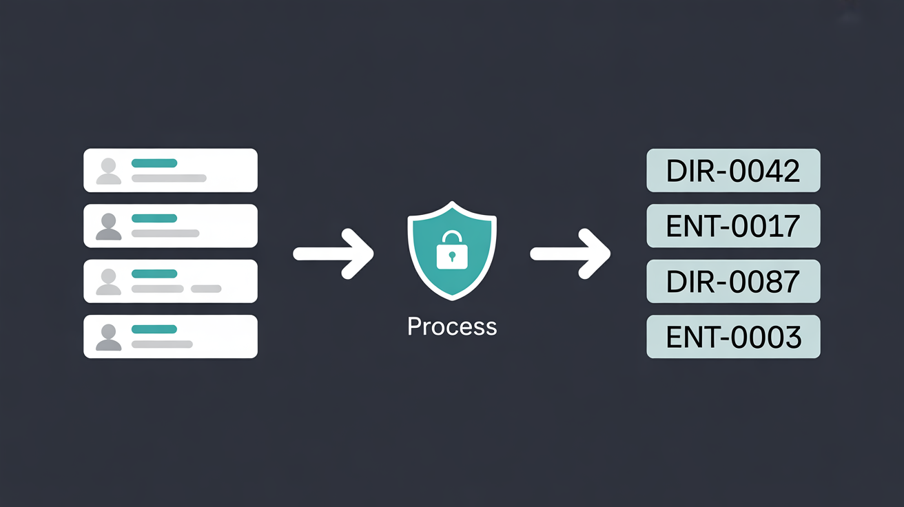 L'IA travaille sur « DIR-0042 chez ENT-0017 ». Pas sur « Jean Dupont chez Renault ». Les vrais noms sont restaurés dans l'interface, après traitement. Traçabilité complète des accès. Hébergement en France.