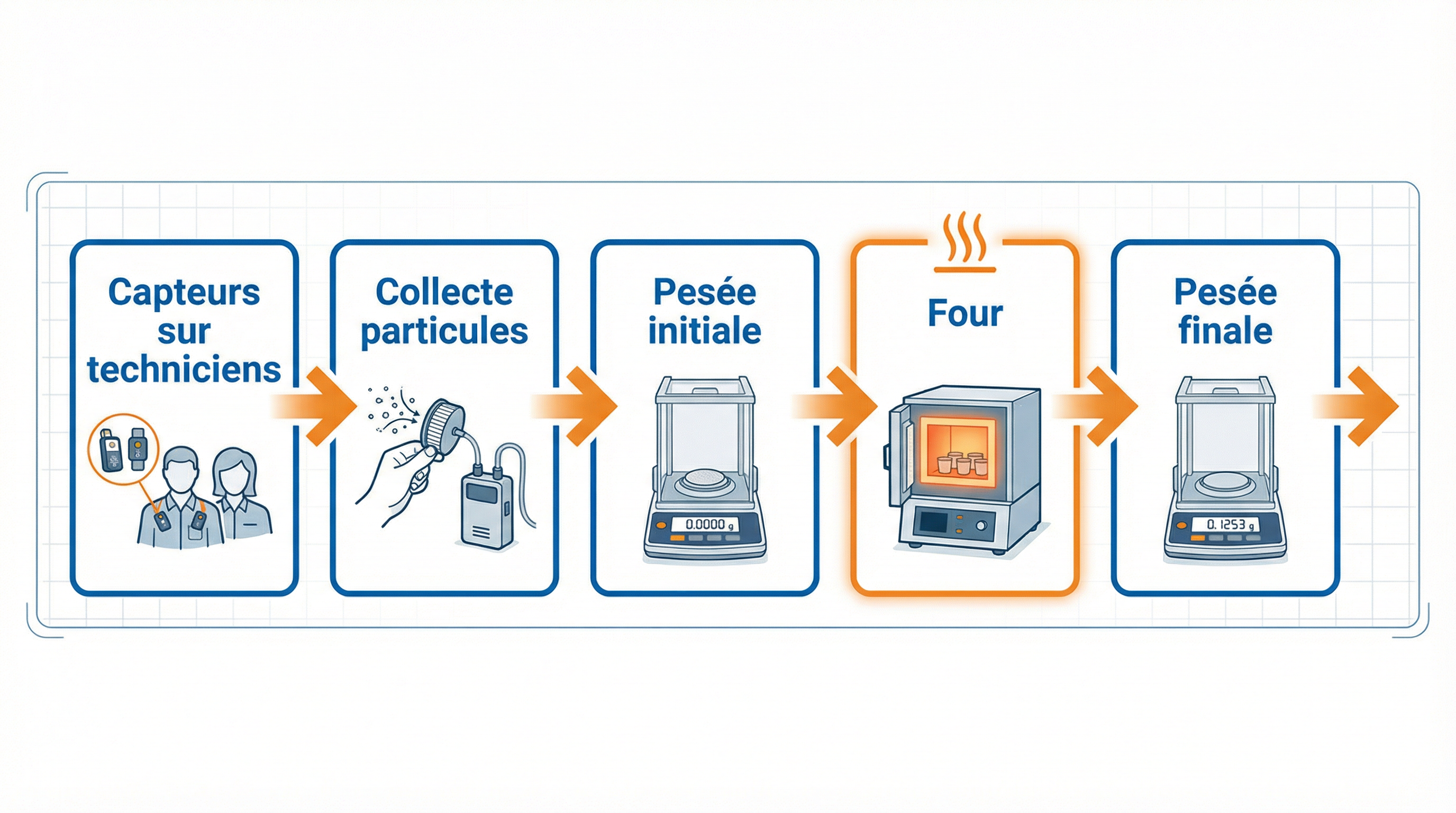 Je me souviens d'un cas qui illustre bien cette approche. On mesurait l'exposition aux particules des techniciens. Le processus était simple en apparence : des capteurs collectent les particules sur des filtres, on pèse les filtres avant et après passage au four pour éliminer l'humidité.