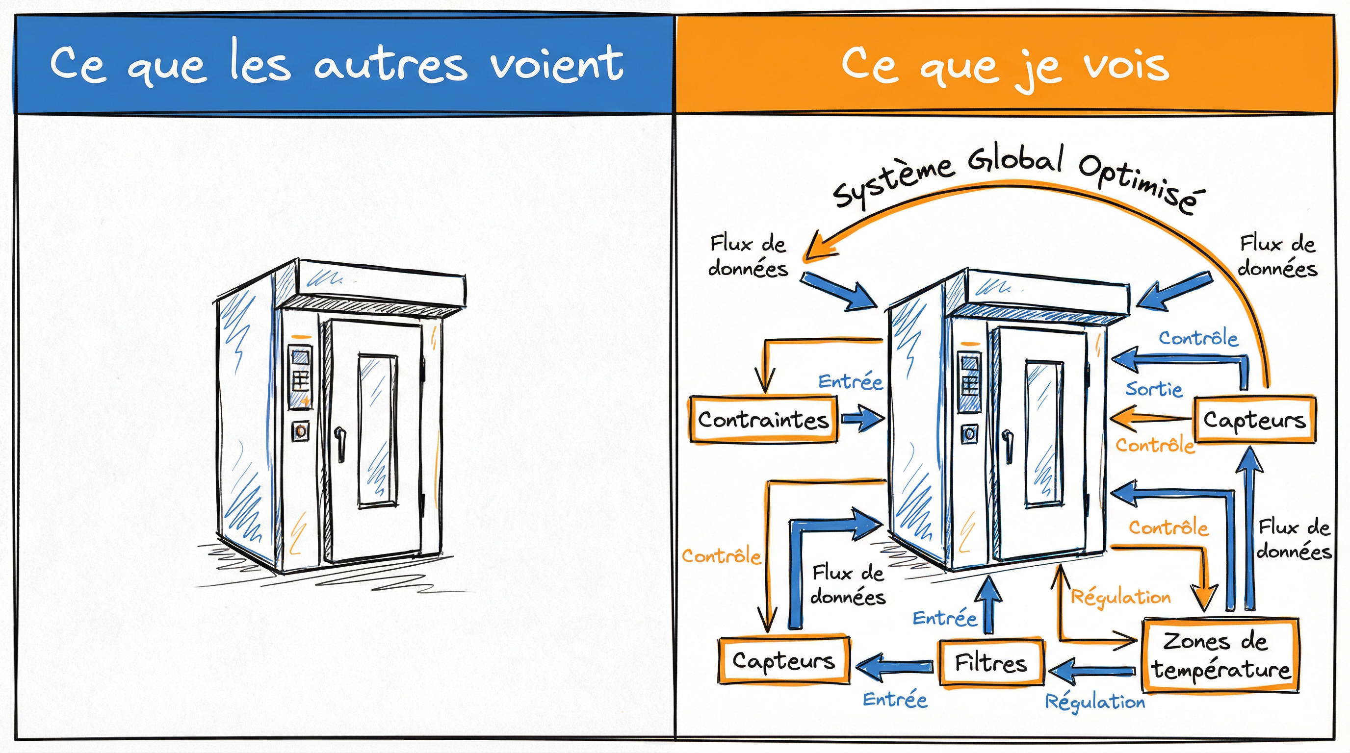 Quand je regarde un banc de mesure, je vois les éléments électroniques, leur rôle, le flux de données entre eux, le processus complet. Je ne vois pas "un appareil". Je vois le système.